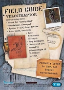 Velociaptors were also encountered during the 2001 Incident when Billy Brennan stole two of their eggs. They were encountered twice, the first time they managed to kill Udesky, while the second they were able to get their eggs back before being scared off by approaching helicopters.
